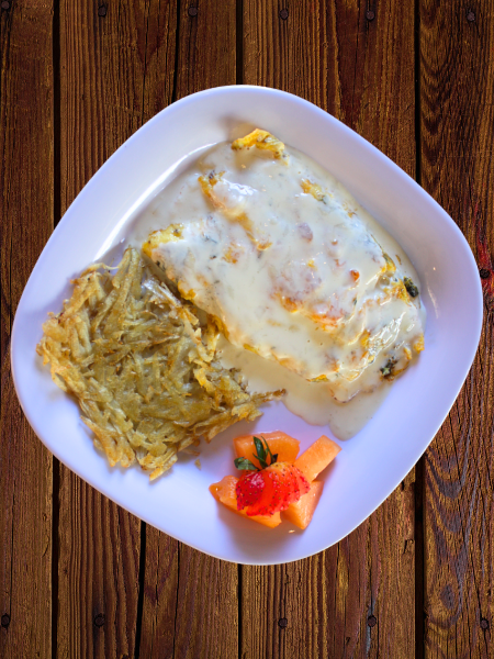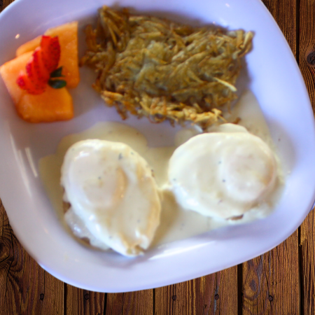 Montados en pan bañados en salsa de queso acompañado de papa hash brown.