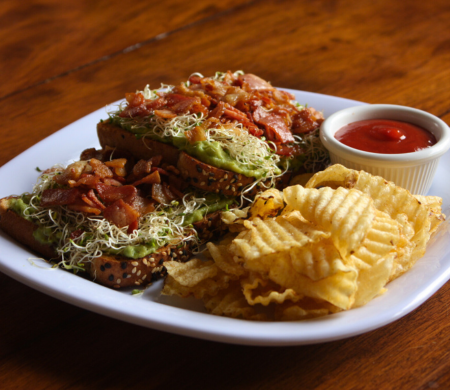 2 piezas de pan tostado con guacamole, huevos estrellados, jamón y tiras de tocino.